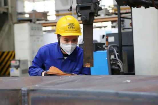 在白鹤滩水电机组焊接过程中,秦建和工艺人员反复试验,最终成功攻克弧焊机器人超厚板焊接质量不稳定、焊接变形控制等难题,将焊接探伤合格率从96%提升到了99%,有效保证了产品质量和交付进度,也将自己锻炼成为一名高技能现代产业工人。